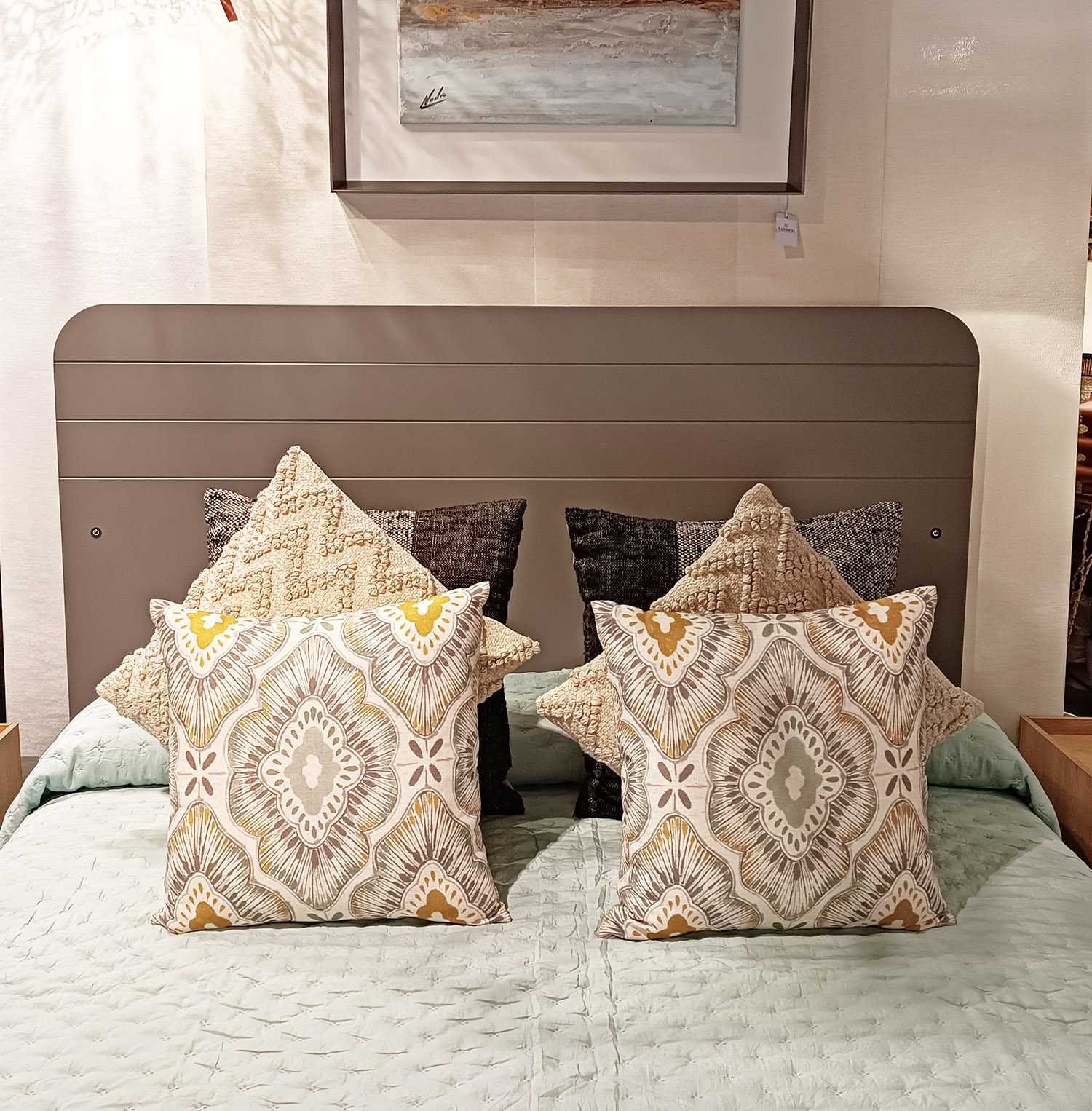 Conjunto de cojines de texturas y motivos naturales, en combinación con el lienzo personalizado elaborado especialmente para el proyecto. Actualmente se puede visitar en la exposición de TANDEM.