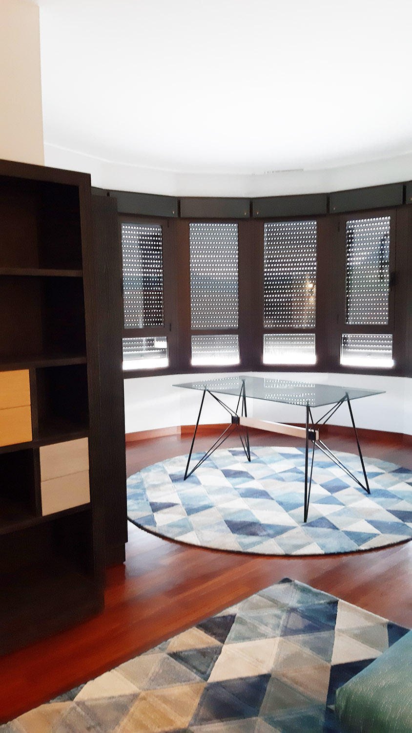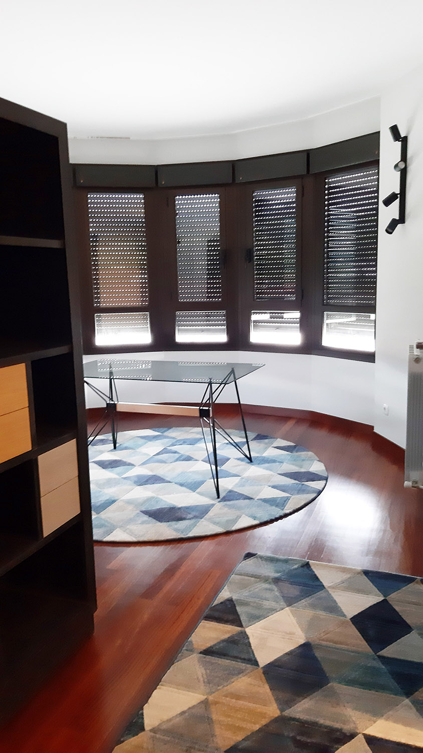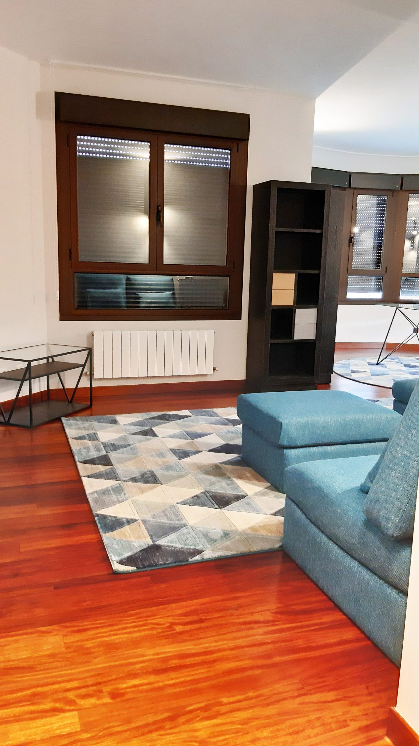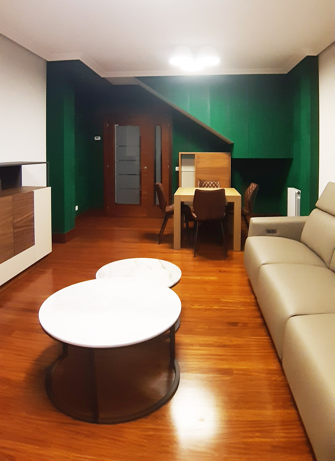 Mobiliario completo para vivienda en Durango. La vivienda se compone de 3 habitaciones, salón, cocina, 2 baños y estudio en la planta superior. Toda exterior. Desde TANDEM nos hemos encargado de amueblar la totalidad de las estancias, hemos creado las alfombras a medida y personalizas, papel pintado en las paredes con texturas. En las habitaciones Cabecero tapizados: madera lacada y ecopiel. Salón comedor con sofá de cuero. Elementos decorativos: iluminación, textil (ventanas y camas), cuadros.