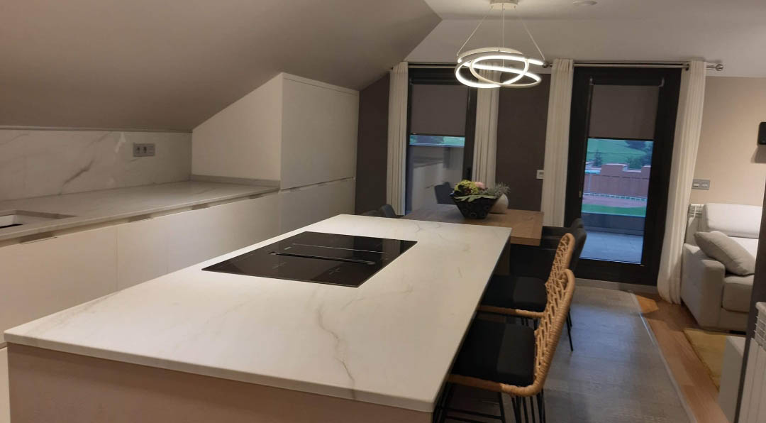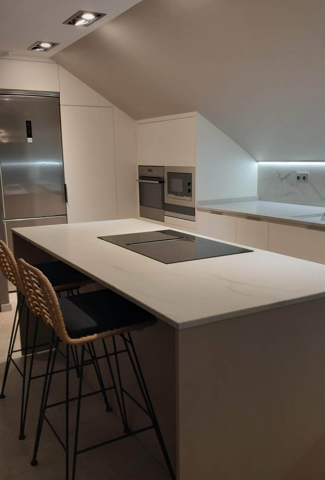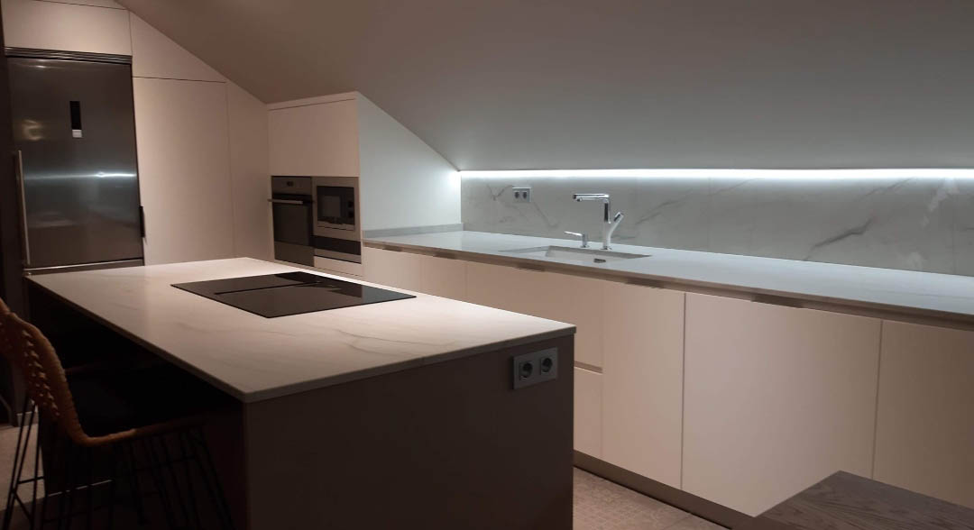 Cocina en líneas simples, minimalista, sin elementos como tiradores, se apuesta por el «menos es más». El mobiliario completo forma parte de un proyecto de renovación integral de la estancia de la mano de TANDEM.