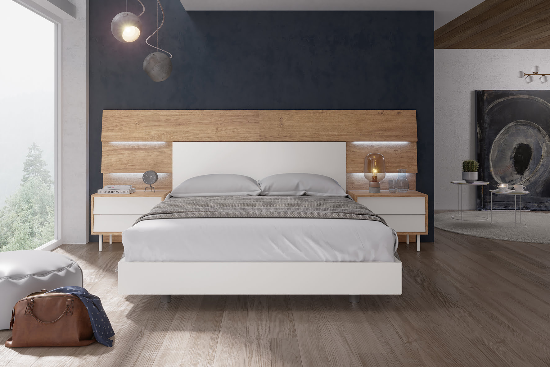 Cabecero en acabado Roble Montana combinado Blanco Mate. La composición  incluye mesita con 2 cajones.
