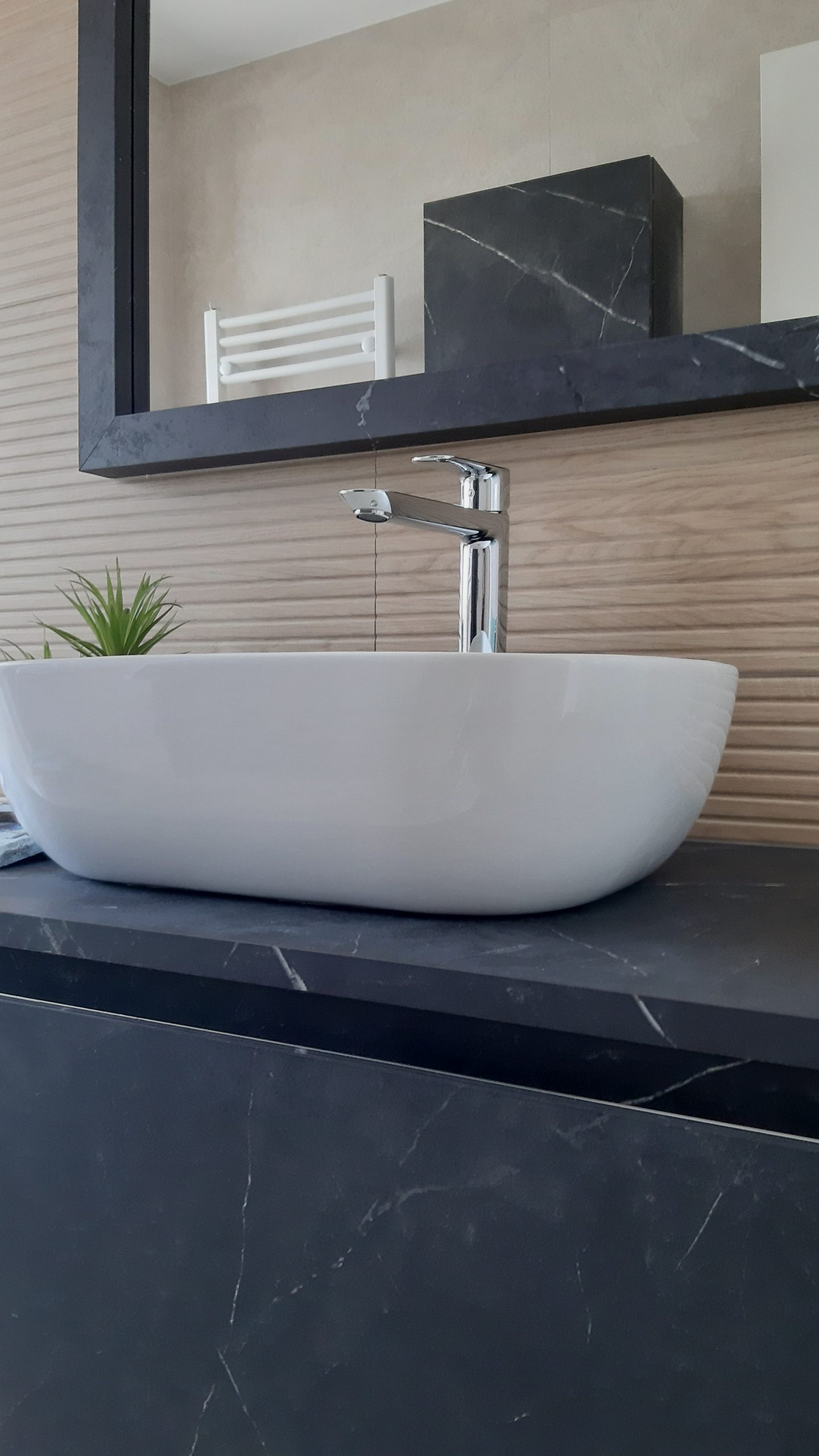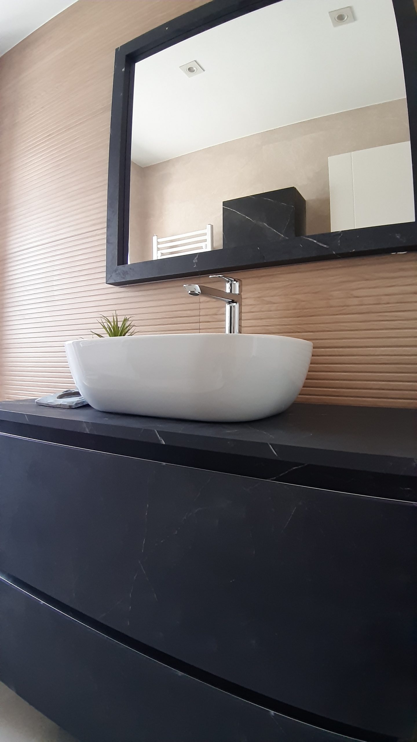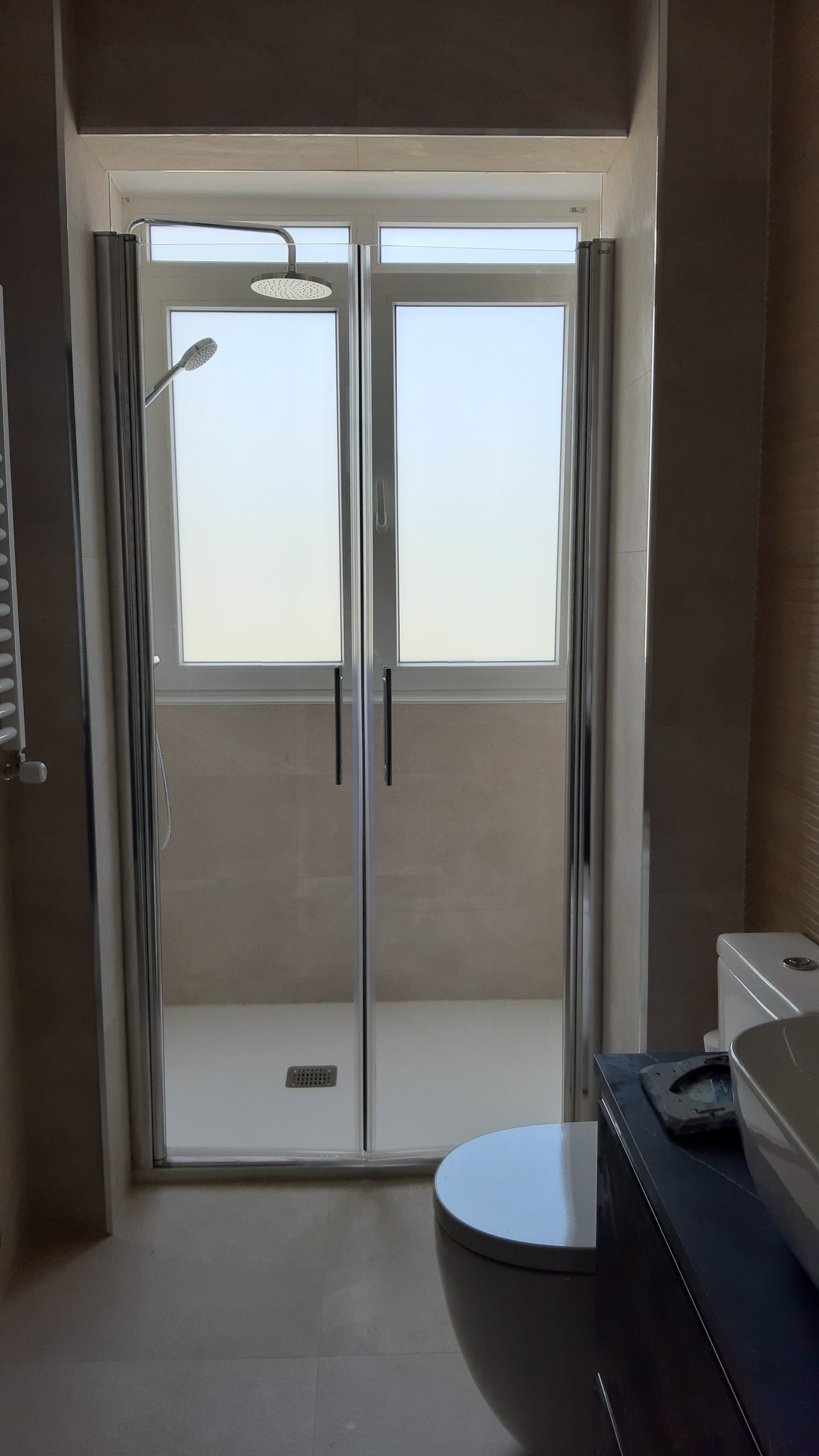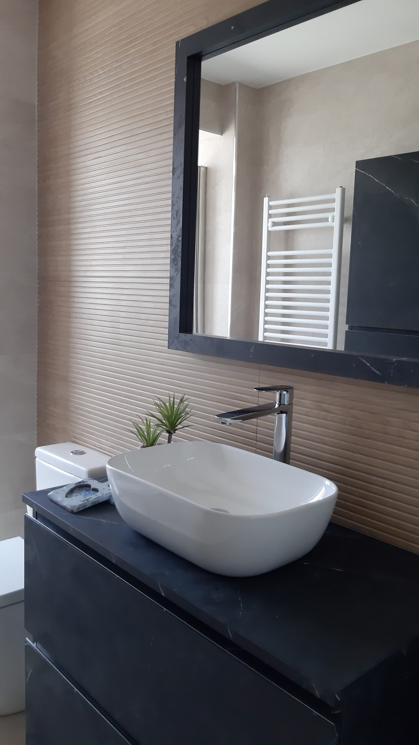 Conjunto de baño compuesto por el equipo de TANDEM para proyecto de reforma. Comprende plato de ducha y zona de lavabo.