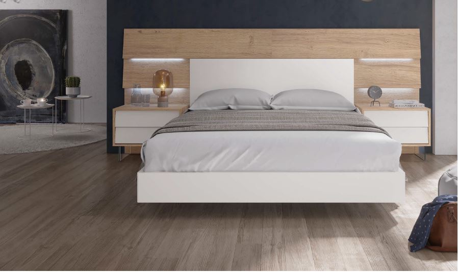 Esta propuesta nos encanta por la madera natural y por la luz indirecta que emana del cabecero de la cama. Nos parece muy original y la luz crea un ambiente muy especial y relajante.